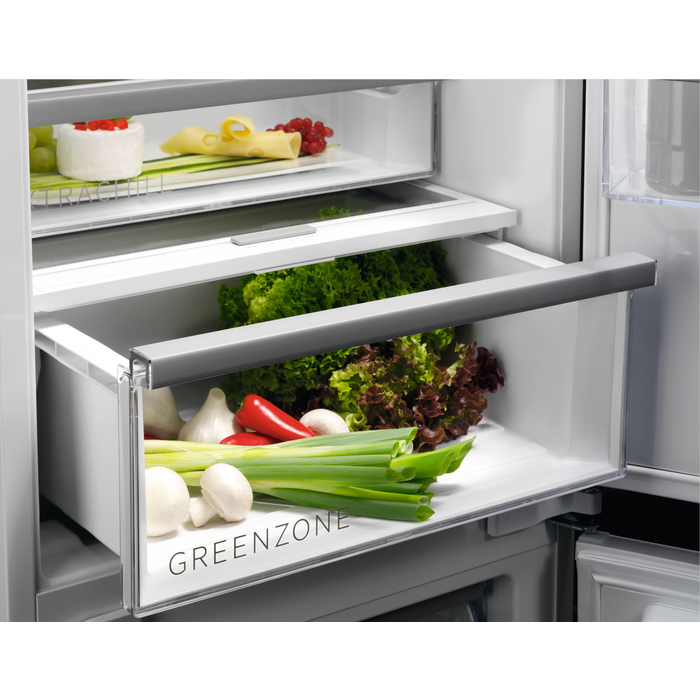 Combina frigorifică Cooling 360° 8000 este prevăzută cu mai multe canale de aer pentru a oferi o răcire constantă. Acest lucru protejează alimentele de pe fiecare raft și ajută la reducerea risipei de alimente cu 28%*. Inoxul oferă aparatului un aspect elegant și premium pentru bucătăria ta