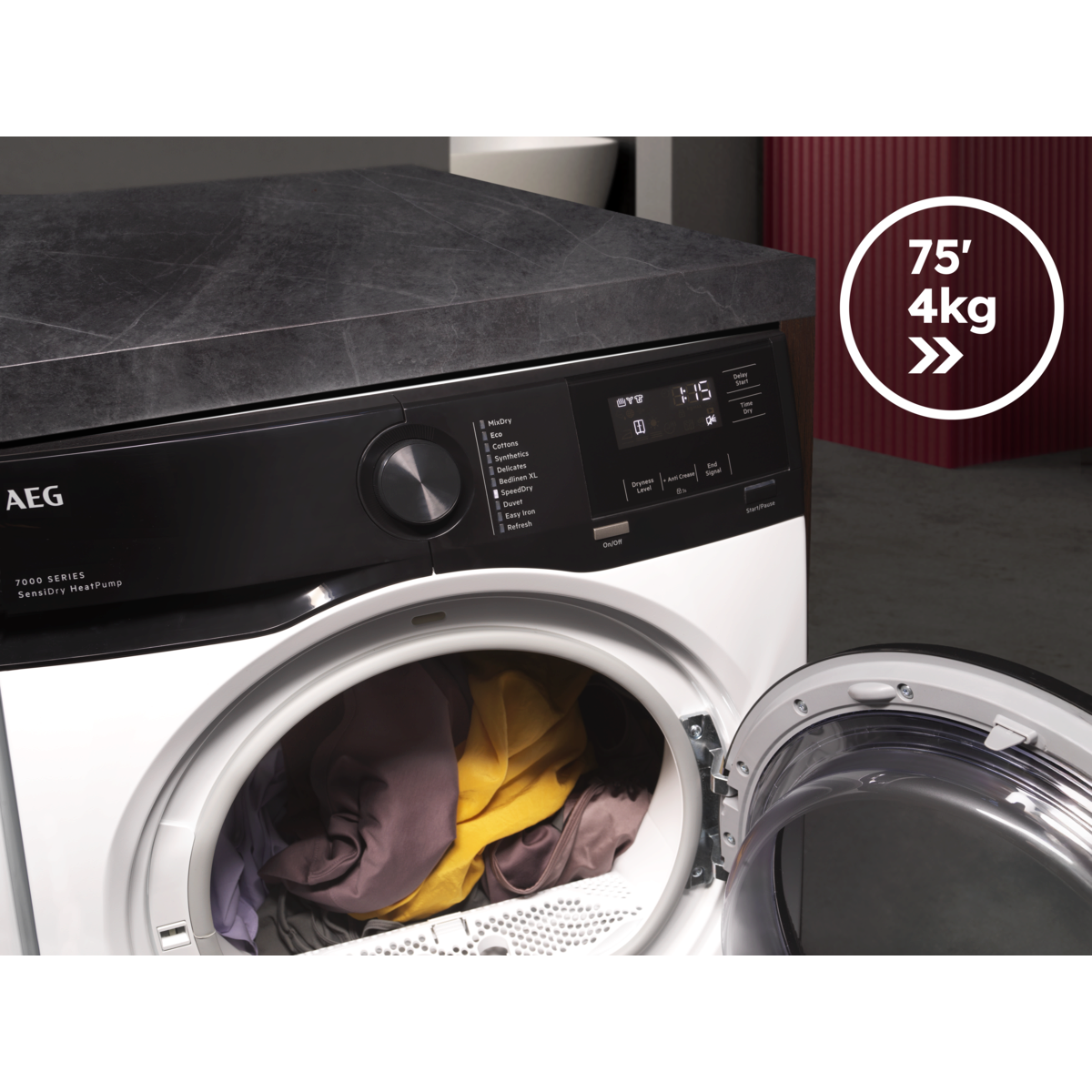 Ciclu rapid pentru zile aglomerate. Usucă delicat până la 4 kg în 75 min.*