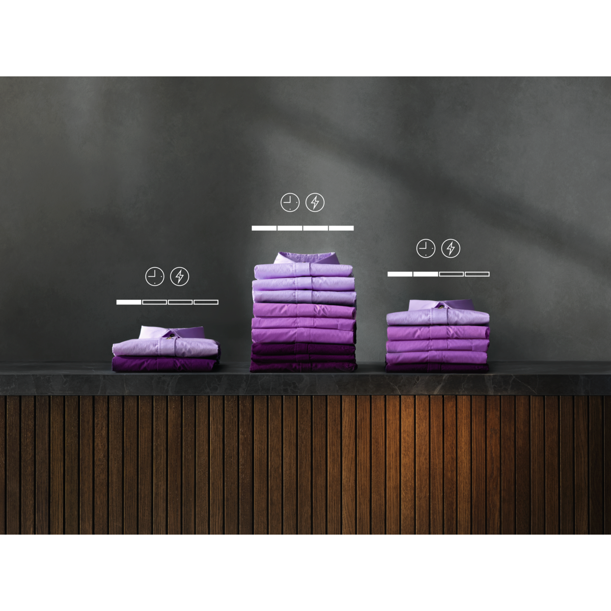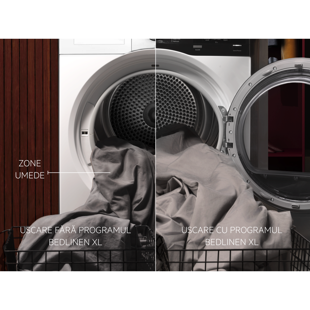 *Pe baza unui test intern efectuat pe 4 kg de ţesături sintetice cu umiditate iniţială de 40%, conform standardului IEC 60456. Durata de uscare poate varia în funcţie de tipul materialului.